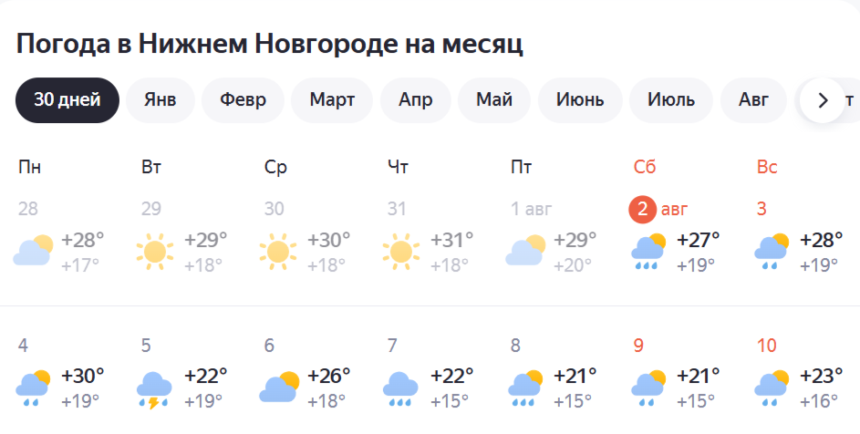 В Нижнем Новгороде на предстоящей неделе с 4 по 10 августа характер погоды начнет заметно меняться. По данным Гидрометцентра России и сервиса Яндекс Погода, после относительно устойчивого и жаркого начала августа ожидается череда дождливых дней - горожанам стоит подготовить зонт и непромокаемую обувь.