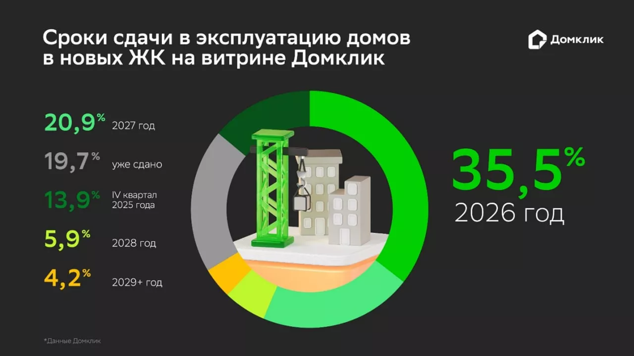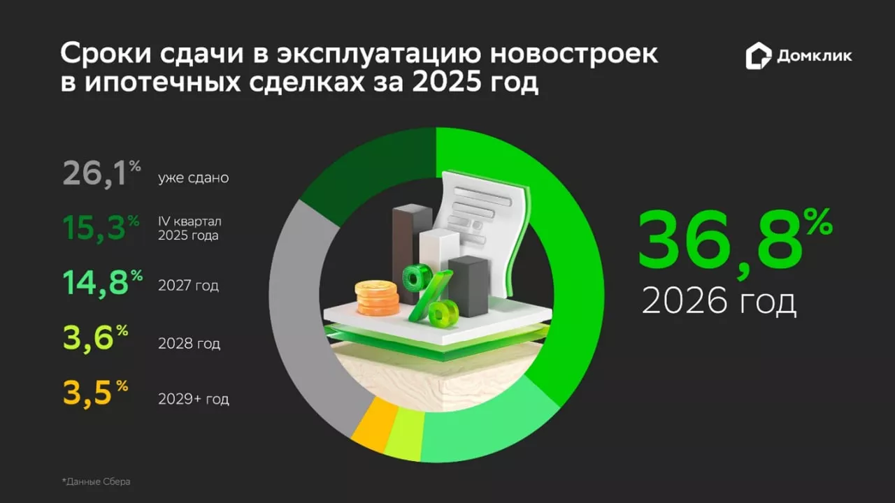 Аналитический центр Домклик изучил, когда будет сдано в эксплуатацию большинство объектов на витрине объявлений сервиса, с каким сроком сдачи берутся ипотечные кредиты на первичку, на каком этапе находится большая часть новостроек и какая доля корпусов в строящихся ЖК прошли аккредитацию Сбера.