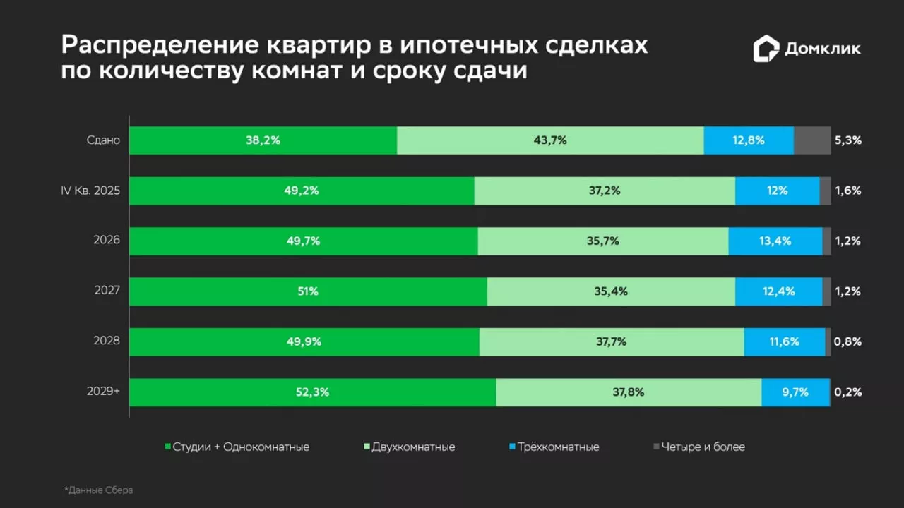 Примечательно распределение ипотечных кредитов на покупку двух- и трёхкомнатных квартир в новых ЖК. Доля трёхкомнатных квартир практически не меняется от года сдачи, однако резко снижается при горизонте сдачи в 2029 году и позже. Обратная ситуация с двухкомнатными – их доля максимальна в уже сданных домах, а в ещё не сданных ЖК снижается и остаётся практически неизменной вне зависимости от года готовности.