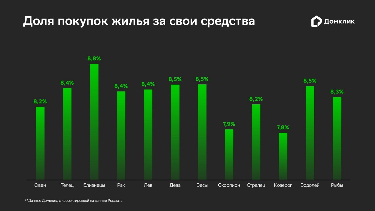 Для подсчета распределения покупателей жилья за собственные средства по зодиаку аналитики Домклик учли неравномерность числа родившихся под теми или иными знаками (рождаемость меняется от месяца к месяцу, а число дней, приходящихся на разные знаки неодинаково). За основу было взято календарное распределение родившихся в 1970 – 1990-е годы. Интересно, что даже после такой корректировки доля покупателей, родившихся в традиционно холодные месяцы, оказалась низкой (за исключением родившихся под знаком Водолея). Наибольшее число покупок совершили Близнецы, наименьшее – Козероги и Скорпионы.