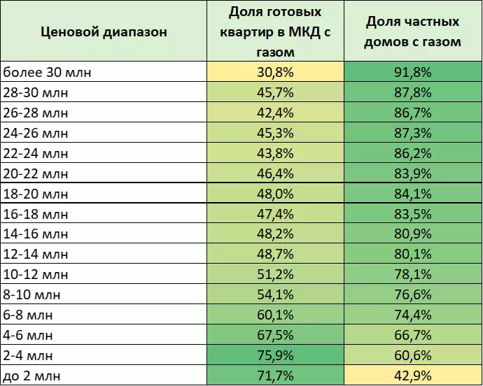 На данный момент на российском рынке недвижимости сложилась ситуация, когда загородные дома, выставленные на продажу чаще газифицированы, чем вторичная недвижимость, находящаяся в многоквартирных домах (МКД). Среди частных домов и таунхаусов доля с подведенными газовыми коммуникациями достигла 71%, а на рынке вторичной недвижимости в МКД – 63,4%.
