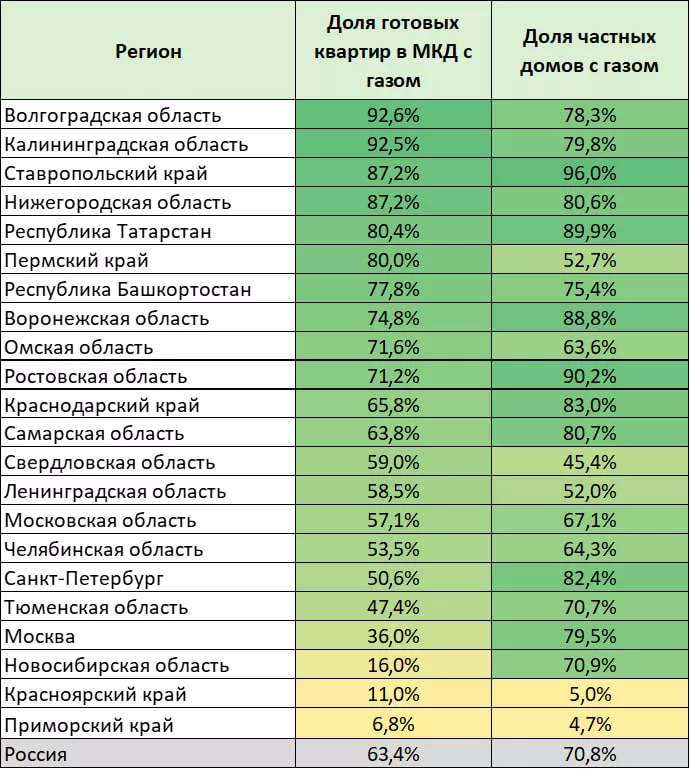 Среди крупнейших российских субъектов, регионами-лидерами по уровню газификации квартир в МКД стали Волгоградская (92,6%) и Калининградская (92,5%) области, а также Ставропольский край (87,2%). Последний является важным газотранспортным узлом для экспорта и поставок газа на Северный Кавказ и в Закавказье. Волгоградская область входит в систему «Южный коридор», связывающей центральные регионы России с южными. Через регион также проходит газ для международного трубопровода «Турецкий поток». Калининградская область является финальной точкой газопровода «Минск – Вильнюс – Каунас – Калининград».