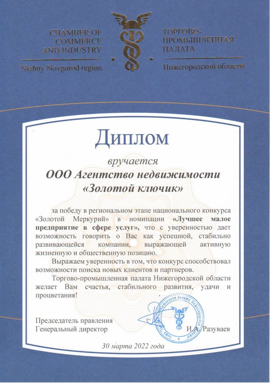 Церемония подведения итогов прошла в стенах Торгово-промышленной палаты Нижегородской области 30 марта 2022 года. Почетную награду вручила директор департамента по работе с партнерскими организациями ТПП НО Наталья Щукина. Она поздравила Ольгу Миронову с победой и сообщила, что конкурсная документация ООО АН «Золотой ключик» отправляется в Москву для дальнейшего участия в федеральном этапе, где к числу нижегородских соискателей премии присоединяться лучшие предприятия со всех регионов России. Итоги всероссийского конкурса будут подведены 24 июня 2022 года.