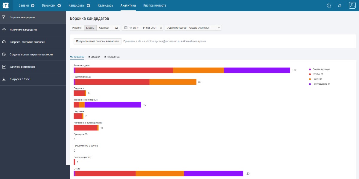 Воронка кандидатов по открытой вакансии администратора-кассира в один из клубов сети