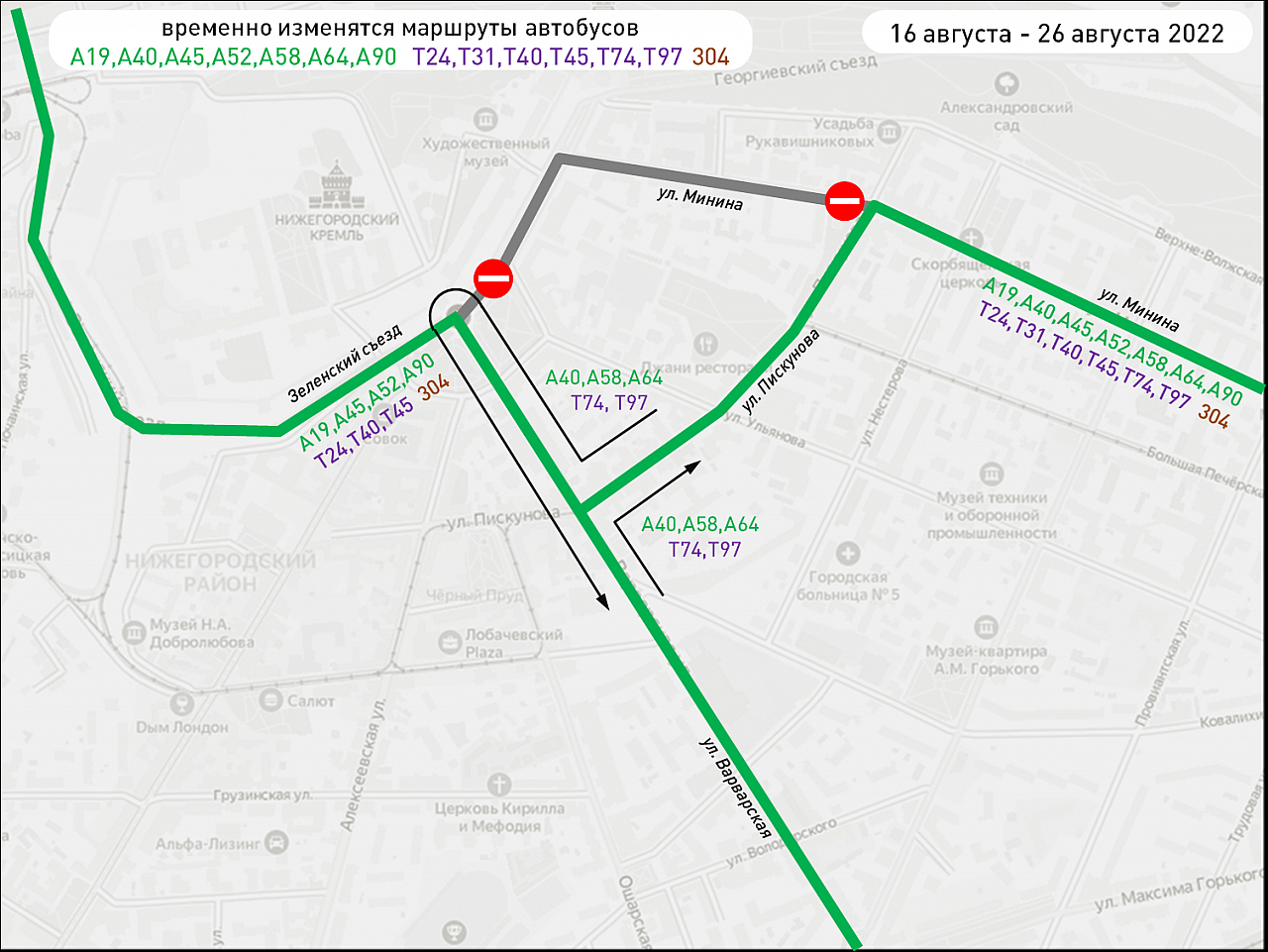 Что касается общественного транспорта, то из-за ограничения движения в центре города изменятся маршруты: А-19, А-45, А-52, А-90, Т-24, Т-40, Т-45, 304. Они будут ходить по улице Варварской, улице Пискунова в обоих направлениях. Маршрутки под номерами А-40, А-58, А-64, Т-74, Т-97 поедут в направлении площади Сенной – по улице Пискунова, в направлении площади Свободы – по улице Пискунова, улице Варварской, площади Минина и Пожарского, улице Варварской.