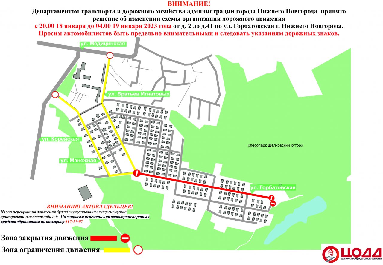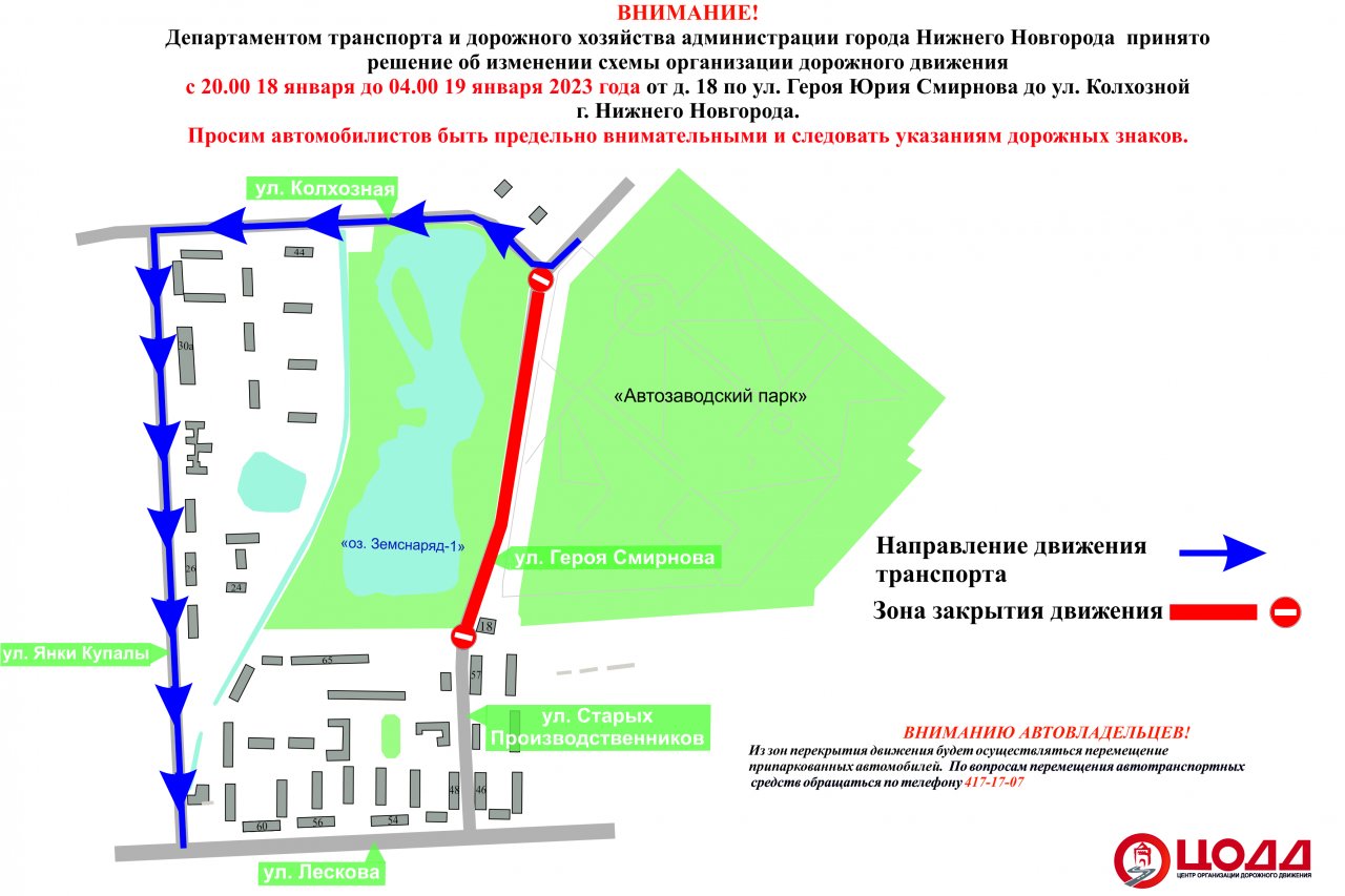 С 20:00 18 января до 4:00 19 января ограничат движение на участке улицы Героя Юрия Смирнова - до улицы Колхозной, на участке улицы Манежной - от улицы Корейской, на участке улицы Братьев Игнатьевых - от улицы Медицинской и на улице Горбатовской.