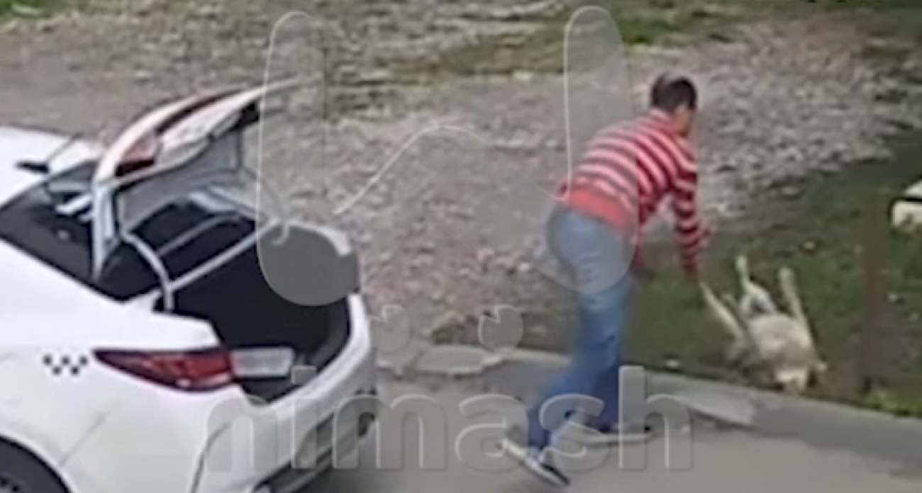 На видеозаписи видно, как мужчина достал животное из багажника автомобиля. Затем он схватил собаку за лапы и бросил ее на землю у входа в приют.