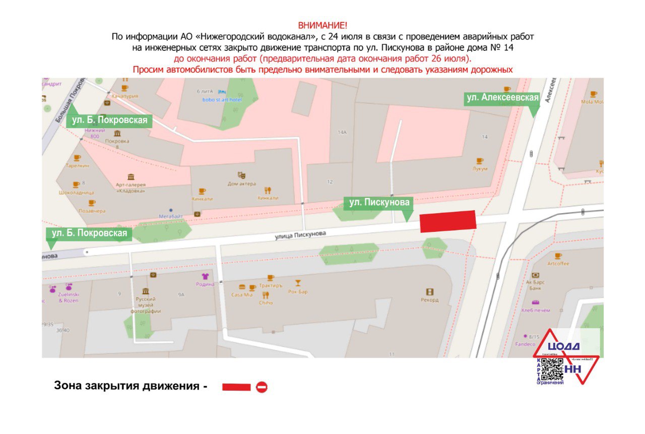 В Нижнем Новгороде с 24 июля на улице Пискунова у дома 14 введены ограничения для транспорта из-за аварийных работ. Движение перекрыто до завершения устранения аварии, предварительная дата окончания работ - 26 июля.