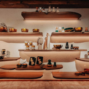 В ассортименте магазина - не только традиционные изделия хохломской росписи, такие как деревянная утварь или посуда. Здесь можно найти современные предметы: аксессуары, украшения, элементы декора, текстиль и даже мебель с узнаваемой росписью. Особая гордость - коллекция, созданная в сотрудничестве с дизайнером Аленой Ахмадуллиной, которую вручную расписывают мастера фабрики "Хохломская роспись" из Семенова.