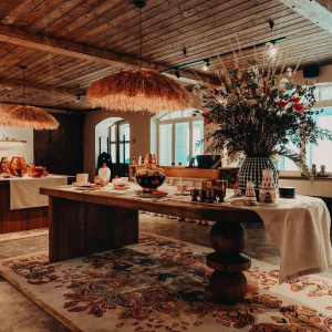Для оформления интерьера дизайнеры вдохновлялись атмосферой местных мастерских и русских изб: деревянная мебель, домотканые скатерти, ковры, даже русская печь - все это помогает передать дух прошлых эпох. Пространство получилось уютным, с теплым светом и обилием натурального дерева.
