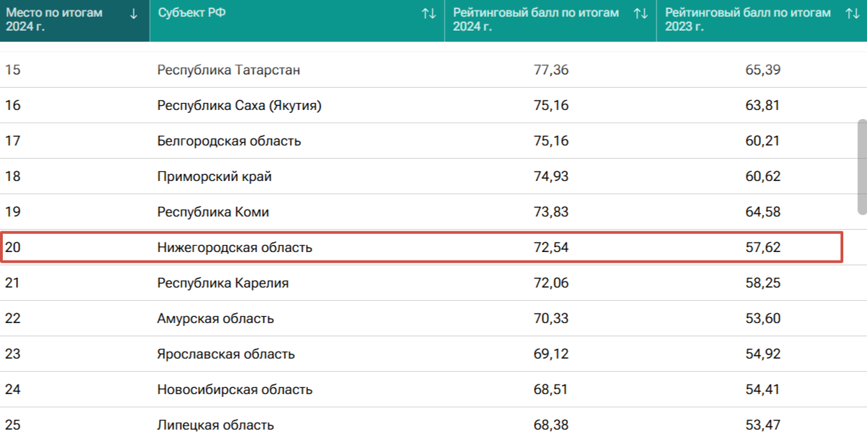 Нижегородская область попала в верхнюю треть рейтинга и заняла 20-е место. Регион набрал 72,54 балла за прошлый год. Это заметный рост по сравнению с 2023 годом, когда область получила только 57,62 балла. Улучшение почти на 15 баллов говорит о положительных изменениях в экономике региона.