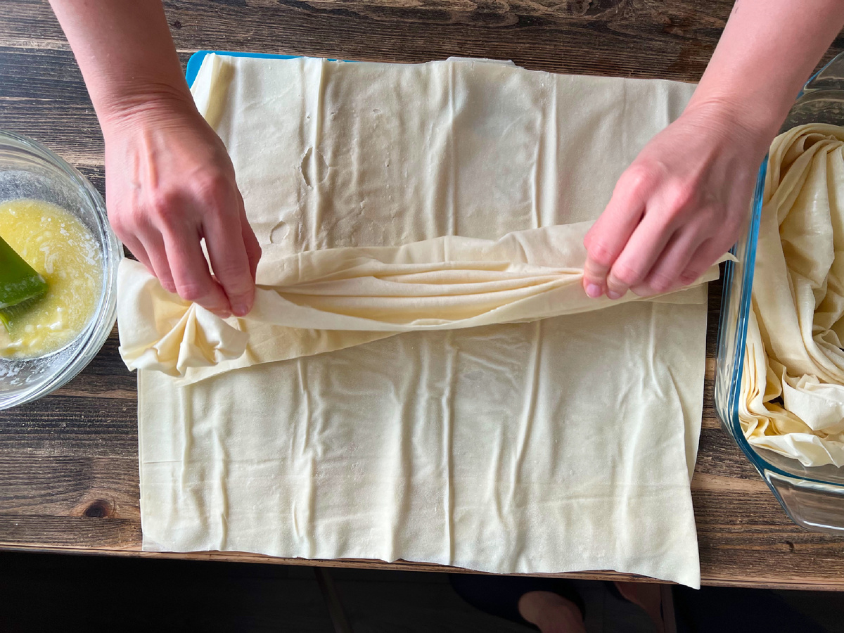 Работать с филло проще, чем кажется: даже ребёнок справится со сборкой. Листы не нужно раскатывать, выдерживать на холоде или бояться, что "сядет" при выпечке. Единственное требование — не пересушить верх: если корочка темнеет слишком быстро, накройте форму фольгой на последние 10 минут. Готовый пирог должен немного остыть перед нарезкой, иначе слои не держат форму и распадаются на тарелке.