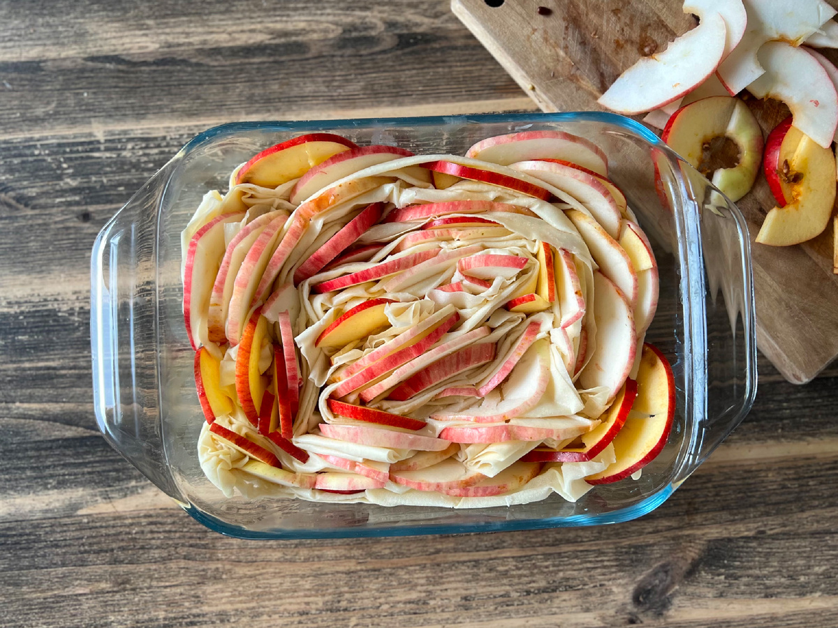 Для сербского варианта яблоки нарезают тонкими дольками, удаляя сердцевину, а листы теста смазывают растопленным сливочным маслом и складывают гармошкой. Затем полоски укладывают в форму, оставляя между ними пространство для яблок. Завершающий штрих — заливка из яиц, сливок и сахара, которая связывает слои и придаёт нежность. После 30 минут при 180 градусах пирог покрывается золотистой корочкой, а внутри остаётся сочным.