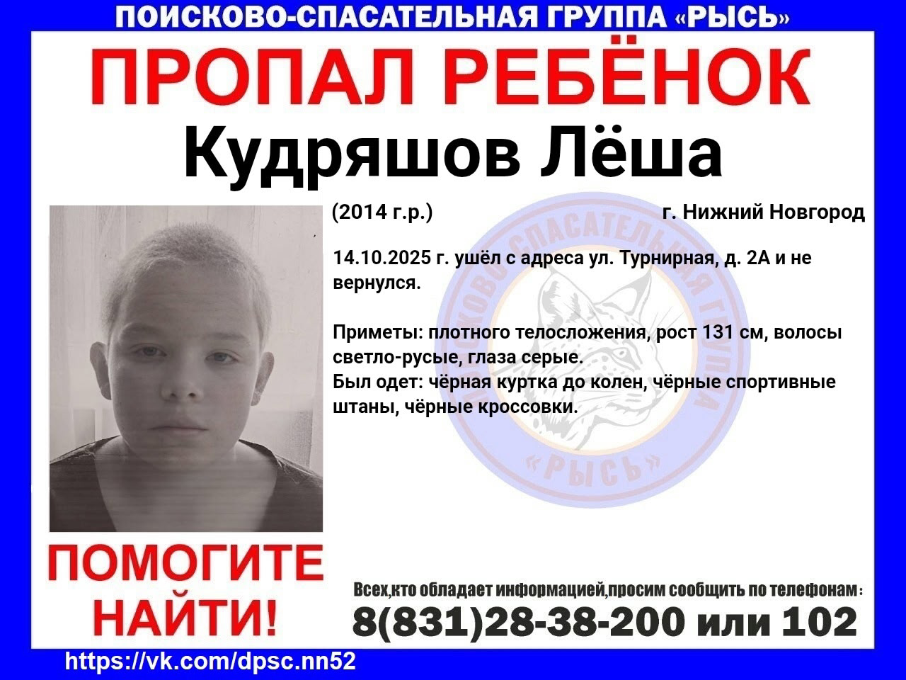 В Нижнем Новгороде разыскивают 11-летнего мальчика, Лешу Кудряшова. Накануне днем он вышел с дома по адресу улица Турнирная, 2А и до сих пор не вернулся.