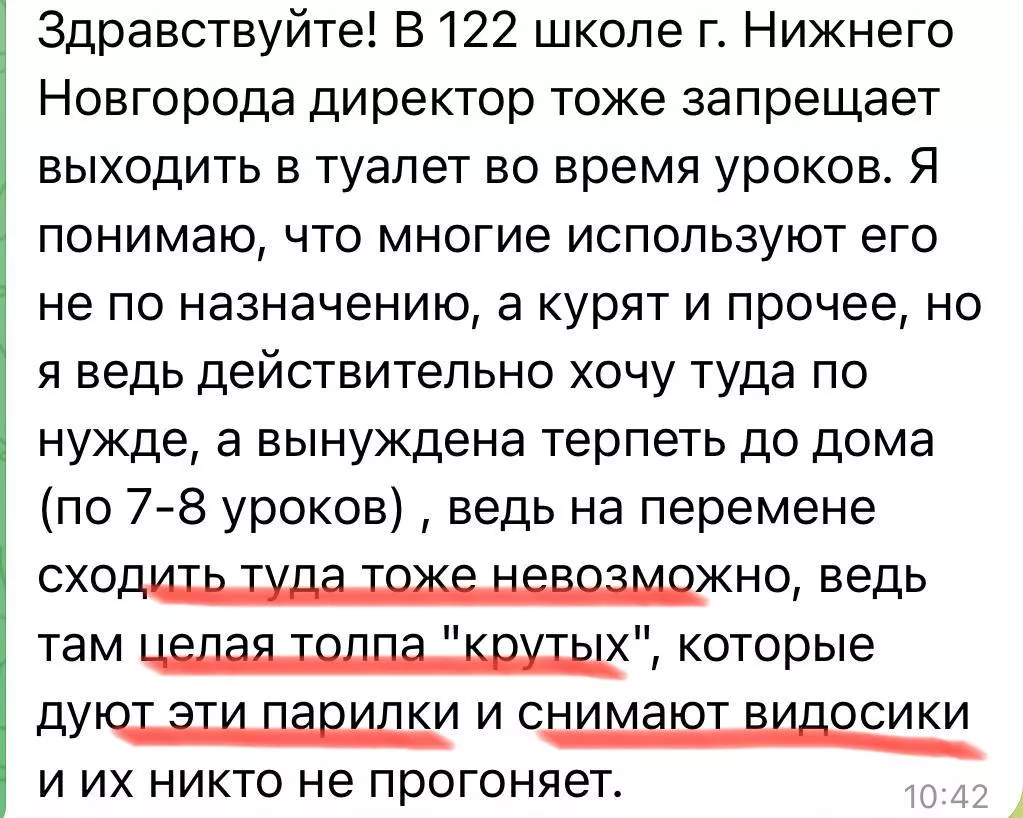 "Так попробуйте попасть в туалет на перемене — тот еще квест. Там либо собираются компании детей, которые просто проводят время. Либо кальянная, все курят вейпы в кабинках, а тех, кто приходит по необходимости не пускают. Вот многие дети и терпят до дома".
