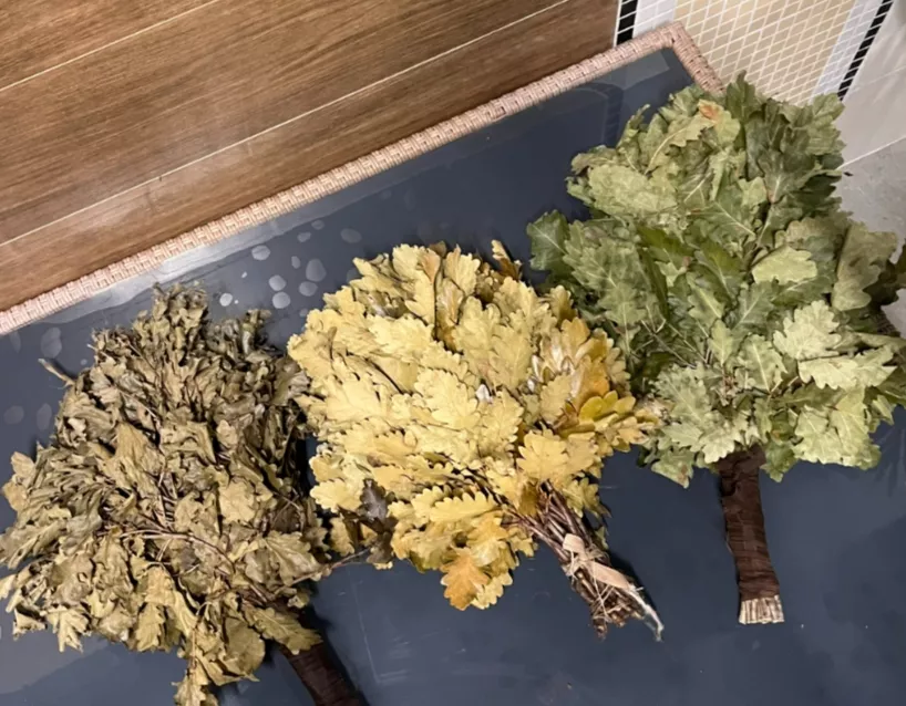Второй веник, который простоял в тёплой воде «как цветы», получился внешне приличным: ветки стали мягче, черенки напитались влагой, веник стал более податливым. Но для результата приходилось ждать половину суток, а за это время он заметно пожелтел. Длительное нахождение в тепле сделало его «варёным», а не свежим. В работе такой веник уже не даёт ощущения живой листвы — он скорее напоминает чуть уставший декоративный букет. Приемлемо, но долго и без восторга.