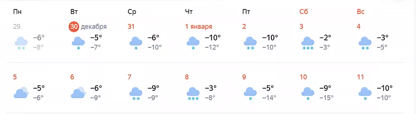 В период с 4 по 7 января вероятно усиление ветра и более заметные осадки: снег местами может идти интенсивнее, с ухудшением видимости на открытых участках и трассах. Температурный фон останется зимним: ночью около −10, днем −3…−6. К Рождеству вновь похолодает до 10 градусов ниже нуля в дневное время суток. В такие дни комфорт на улице будет сильнее зависеть от ветра — при порывах ощущаемая температура окажется ниже фактической.