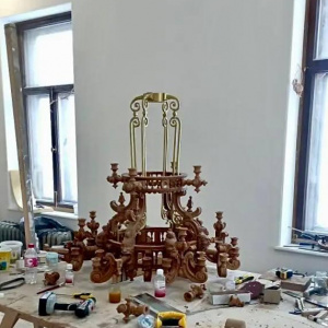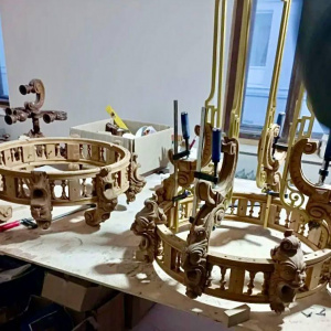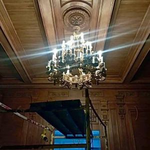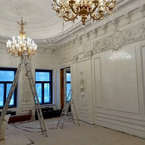 Сейчас мастера почти закончили оформление Дубового зала, где уже установили первую дубовую люстру и занимаются нанесением позолоты на лепнину. Работы по восстановлению лепного декора завершены почти на 94 процента. В таком же состоянии готовности находятся и новые металлические отливы на фасаде здания.