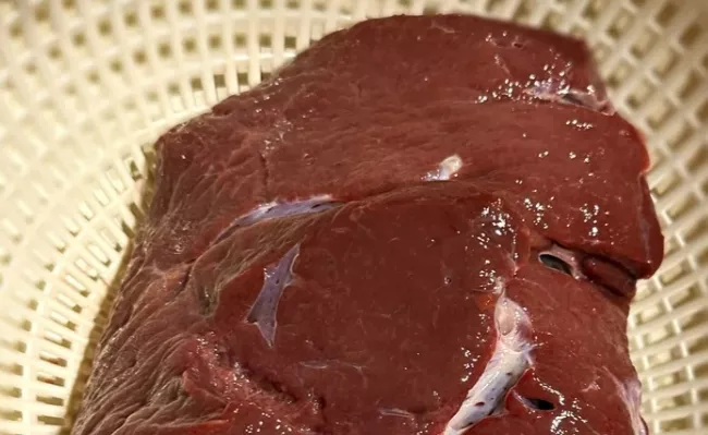 Берите свежую говяжью печёнку — лучше всего деревенскую, не мороженую. Промыли, обсушили, убрали плёнки и сосуды, нарезали кусочками. Десять минут — не дольше.