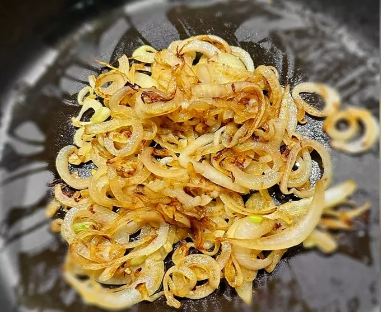 Лук нужен щедро — минимум пара головок, а лучше граммов триста. Нарезали кольцами и карамелизовали в масле на сильном огне: постоянно помешивать, чтобы не подгорел. Через пять минут лук станет мягким, золотистым и сладковатым — то, что нужно.