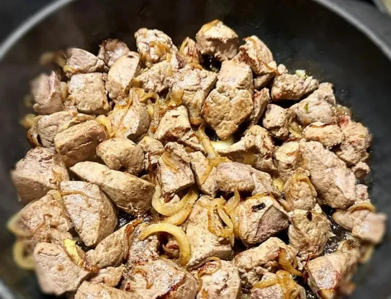 Теперь печёнка. Добавляете её к луку, перемешиваете — и сразу видно, как она схватывается от жара. Шипит, темнеет, но остаётся сочной.