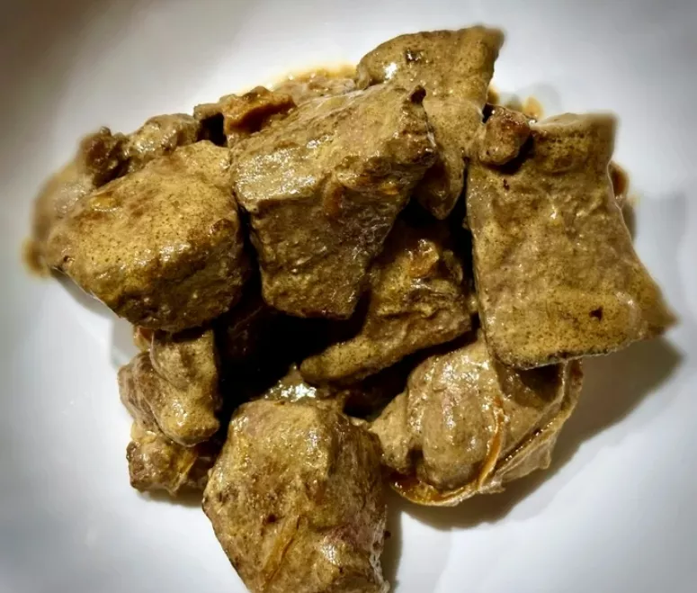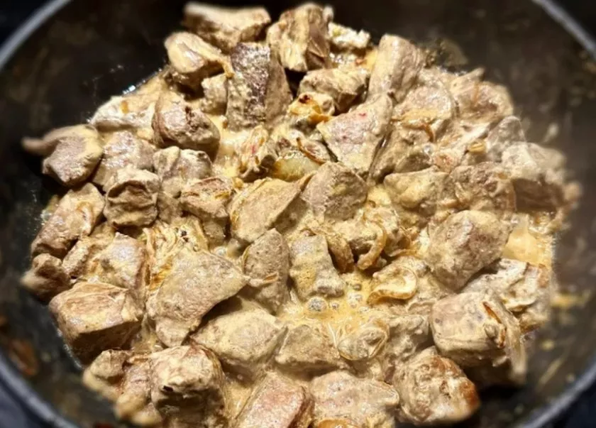 Накрыли крышкой, дали постоять три минутки — и блюдо готово. Ни муки, ни загустителей, ни приправ кроме соли и перца. Мягкая, вкусная печёнка с нежным соусом и сладковатым луком — отличный ужин на троих.
