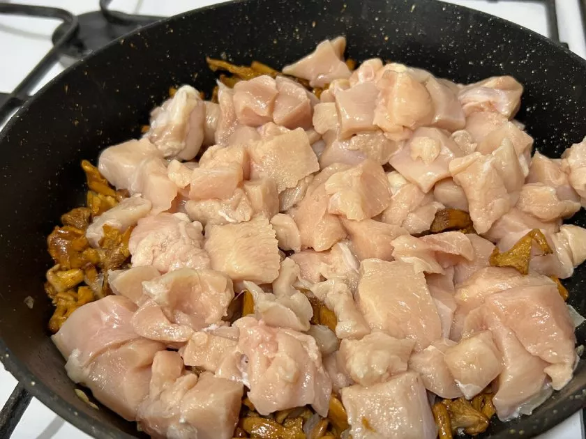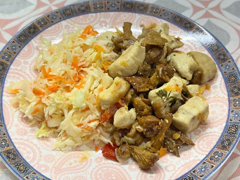 Готовили просто, без героизма. Я нарезал курицу кусочками. Диана сделала поджарку — лук и морковь, потом добавила лисички. Грибы у нас ещё с прошлого лета в морозилке лежали: решили «расхламить запасы» перед новым сезоном. Всё это вместе потушили с куриным филе, довели до готовности, чтобы получилось что-то домашнее и понятное, без лишних соусов. На гарнир сделали капустный салат — мы сейчас на более лёгком питании, поэтому капуста, свёкла, простые блюда и грудка заходят идеально.