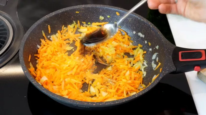 Отдельно подготовьте овощи. Одну луковицу нарежьте мелким кубиком, морковь (по желанию) натрите на тёрке. На сковороде разогрейте немного растительного масла, сначала обжарьте лук до полупрозрачности, потом добавьте морковь и потушите ещё пару минут. Влейте столовую ложку соевого соуса, быстро прогрейте смесь ещё около минуты и снимите с огня. Овощи можно оставить так или дополнительно пробить блендером/прокрутить, если хотите максимально нежный фарш.
