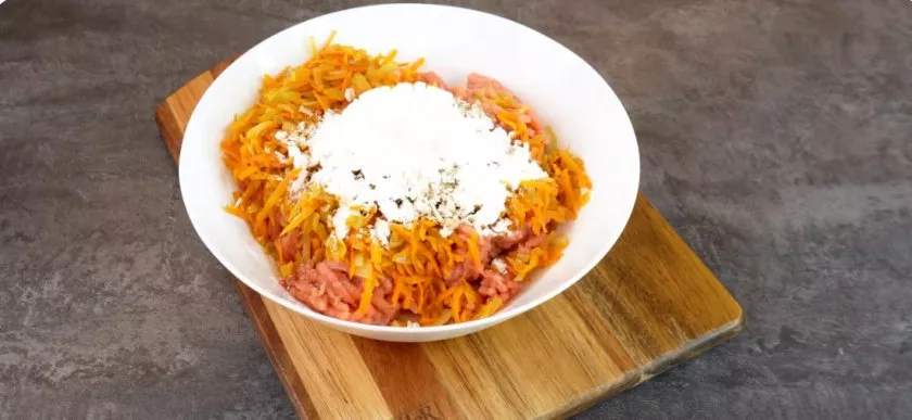 Теперь — ключевой момент. К рыбному фаршу добавьте тёплые овощи и одну столовую ложку овсяных хлопьев быстрого приготовления. Это и есть тот самый секрет: хлопья впитают лишнюю влагу и часть характерного рыбного запаха, сделав структуру котлет более плотной, но при этом нежной. Добавьте столовую ложку крахмала (картофельного или кукурузного), пол‑чайной ложки соли, молотый чёрный перец или смесь перцев по вкусу. Всё тщательно перемешайте до равномерной массы.
