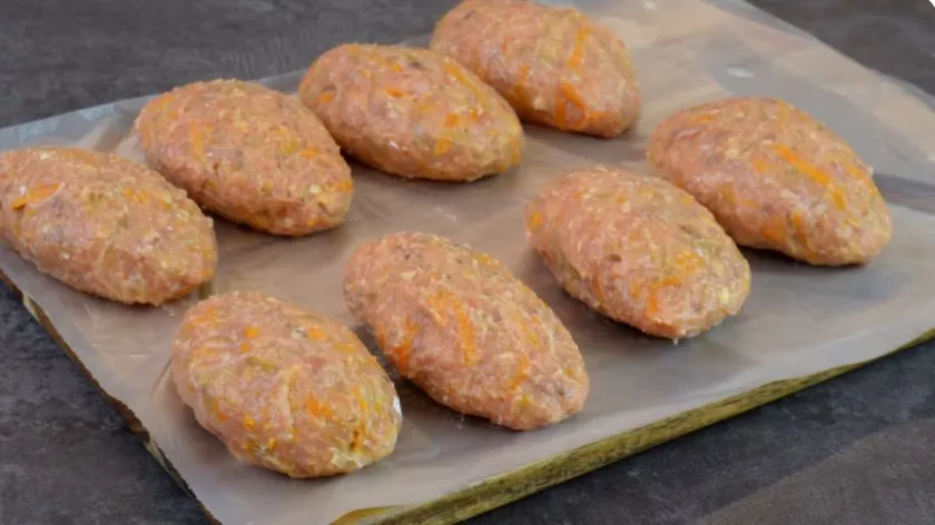 Обязательно уберите фарш в холодильник минимум на 20 минут. За это время овсяные хлопья набухнут, свяжут сок, расправятся, и масса станет более устойчивой. Именно на этом этапе уходит большая часть «резкого» запаха: котлеты потом пахнут не рыбой, а лёгкой пряной смесью лука, моркови и специй. После охлаждения влажными руками сформируйте котлеты весом примерно по 90–100 граммов. Из указанного количества получится около восьми штук. По желанию можно обвалять их в сухарях, но рецепт работает и без панировки.