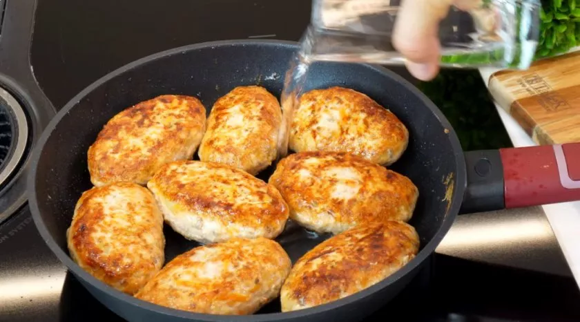 Жарить лучше в два этапа. Сначала на хорошо разогретой сковороде с небольшим количеством масла обжарьте котлеты до румяной корочки с обеих сторон. Рыбный фарш масло почти не впитывает, поэтому «тяжёлого» жирного вкуса не будет. Когда все котлеты подрумянятся, слейте лишнее масло, верните котлеты в чистую сковороду, влейте около 70 мл воды, накройте крышкой и тушите на слабом огне 10–15 минут. Так они дойдут до готовности, останутся сочными внутри и не развалятся.