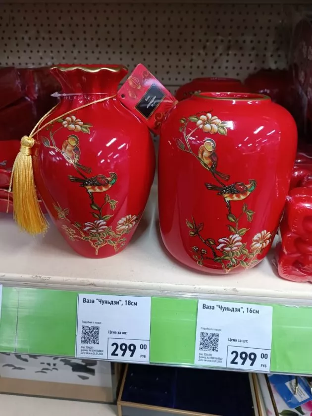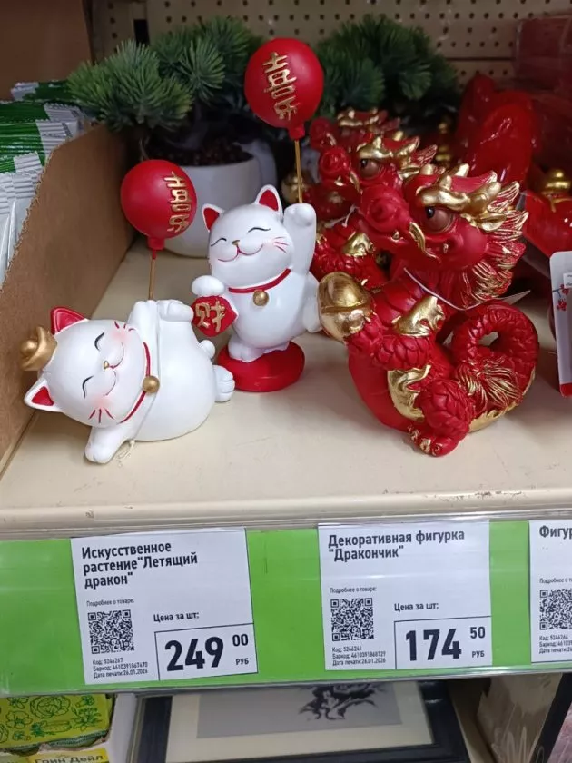 Главный визуальный акцент завоза — яркая японская коллекция. На общем фоне она сразу бросается в глаза: красные и розовые оттенки, сакура, драконы, японские мотивы. В линейке много предметов для интерьера и при этом достаточно практичных вещей для кухни. Длинные ветки сакуры (примерно до метра) подходят для напольных ваз или высоких сосудов, есть розовый и красный варианты. Декоративное деревце «Летящий дракон» в горшочке удобно ставить на полку или комод, а фигурки драконов, котов манэки‑нэко и керамических лошадок «Хон Ма» работают как небольшие акценты в комнате или кухонной зоне.