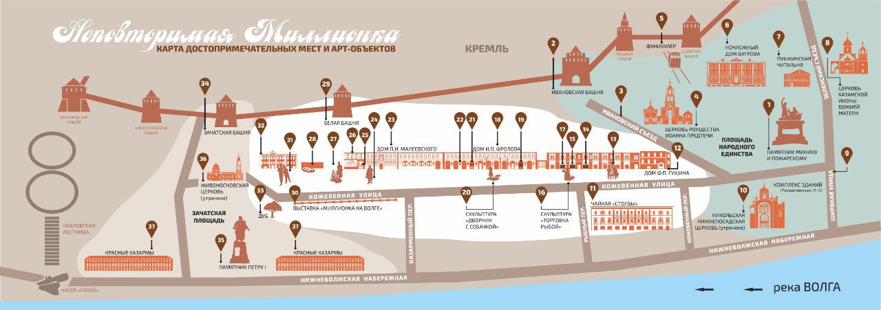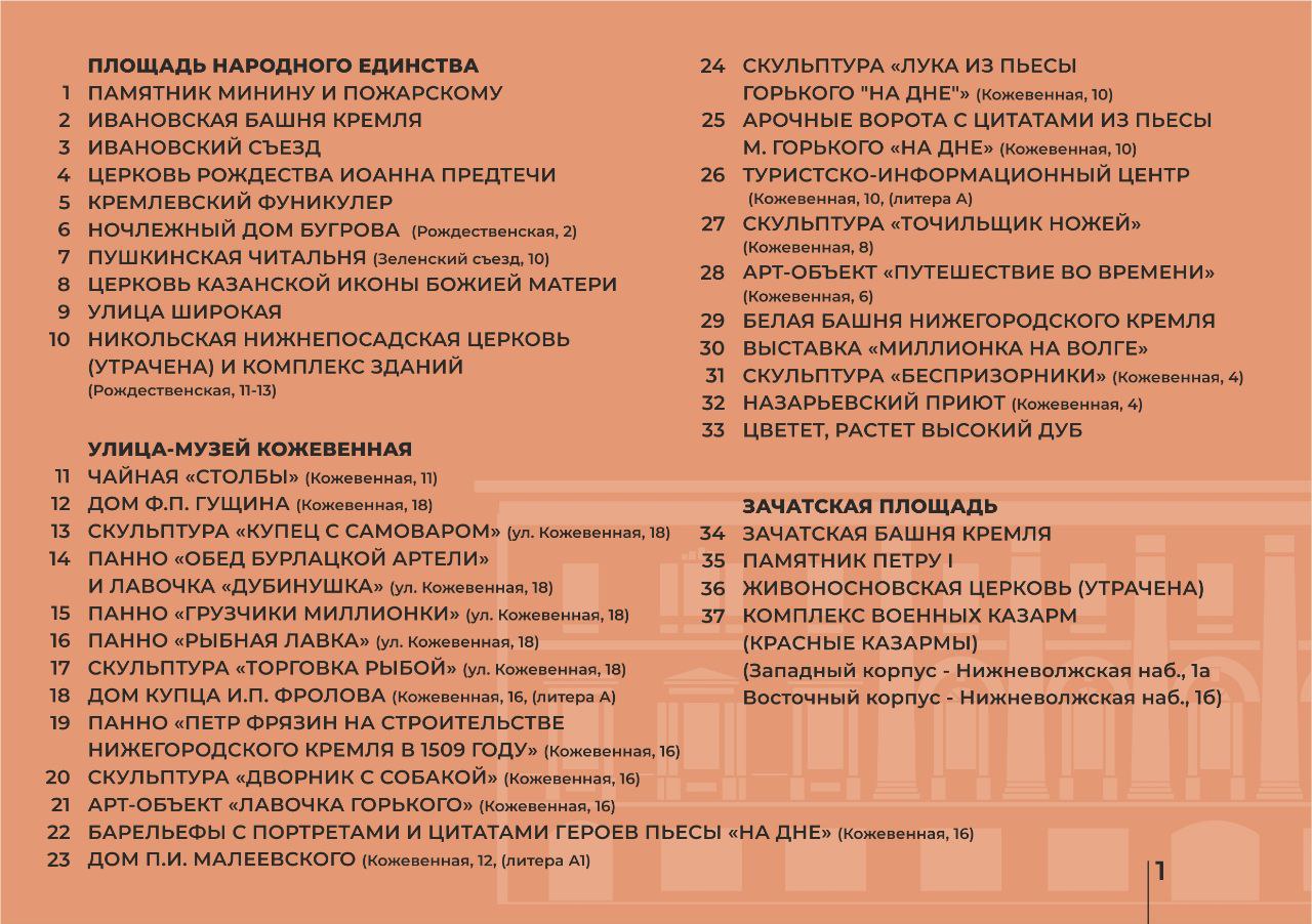 В предполагаемое музейное пространство планируется включить 37 объектов, расположенных на улице Кожевенной, площадях Народного единства и Зачатской. В их число входят: фуникулер у Кремля, ночлежный дом Бугрова, чайная "Столбы", различные храмы, жилые дома, скульптурные композиции, выставки под открытым небом, объекты современного искусства, барельефы, комплекс красных военных казарм и Зачатская башня Нижегородского кремля.