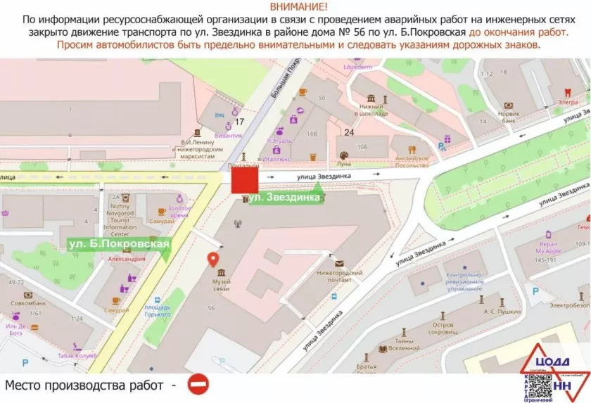 Движение машин по улице Звездинка в районе дома № 56 по улице Большая Покровская временно закрыли из-за аварийных работ на инженерных коммуникациях. Ограничение будет действовать до завершения ремонта.