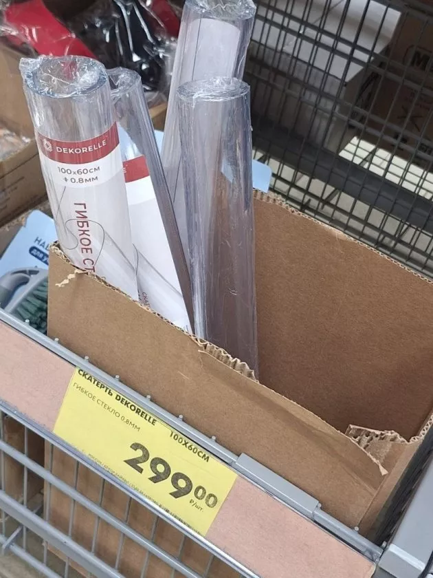 Эта вещь стала для меня настоящим открытием. Скатерть-защита из прозрачного гибкого ПВХ-стекла толщиной 0,8 мм, размером 100×60 см.