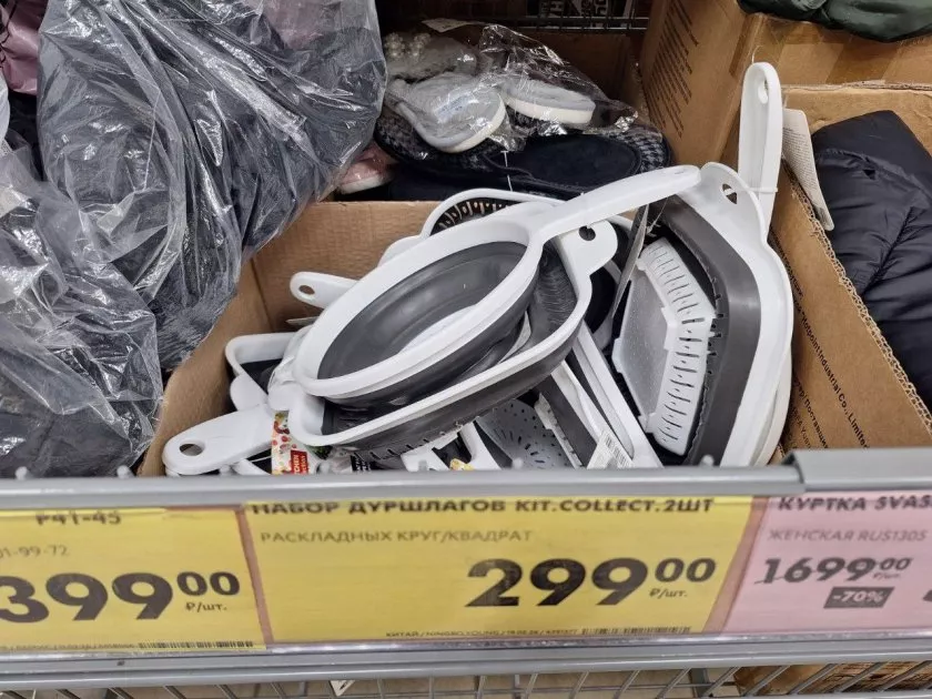 И, пожалуй, самая практичная покупка из всех пяти. Набор из двух складных силиконово-пластиковых дуршлагов — круглого и квадратного. Бренд Kit.Collection, производство Китай.