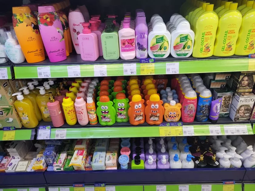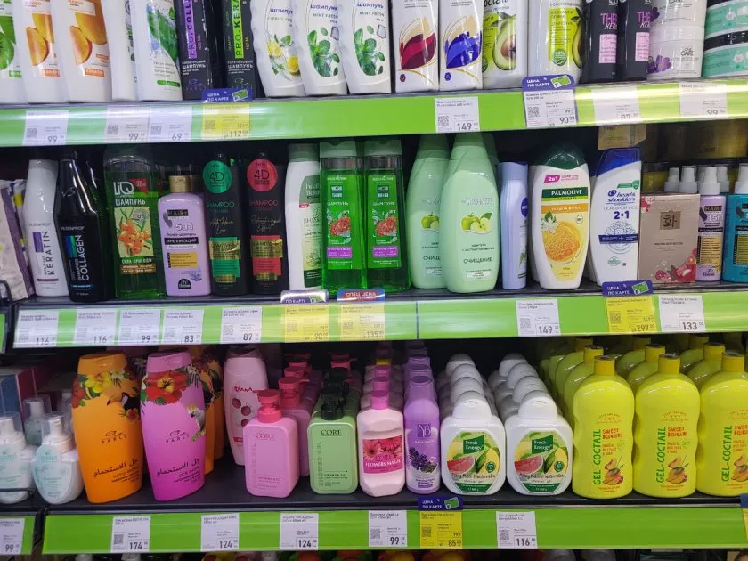 Гели для душа — пёстрые, с забавными упаковками: Le Core, Solzao, Parli. Последний хвалят за приятные отдушки, и судя по полке, в ФП он прижился надолго. Жидкое мыло Milana, кусковое Duru, Palmolive и даже Rexona — ассортимент вполне типичный для любого районного супермаркета. Из неожиданного — мыло Caprice, которое в обычных магазинах почти не встречается.