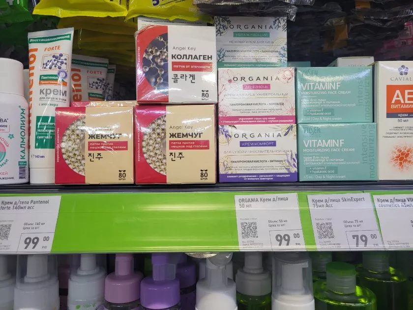 Уход за лицом — самый загадочный отдел: большинство брендов незнакомые, без истории и узнаваемости. Из понятного — энзимная пудра B.U.T.Y., спрей с каламином и пантенолом (каламин реально помогает раздражённой коже), солнцезащитные кремы Floresan. Лосьоны для тела Sadoer — китайский бренд, который есть и в «Золотом яблоке» — и крем-воск Yokitoki, чьи капсулы для стирки популярны на Wildberries. Декоративной косметики в этом конкретном магазине не оказалось вовсе.