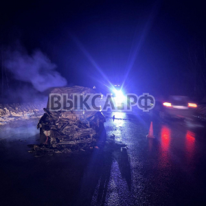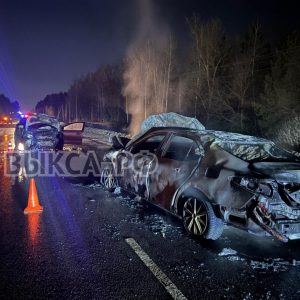 Водитель Kia Rio выехал на встречную полосу и лоб в лоб врезался в Toyota Camry. После удара оба автомобиля загорелись: Camry выгорела полностью, Rio — частично.