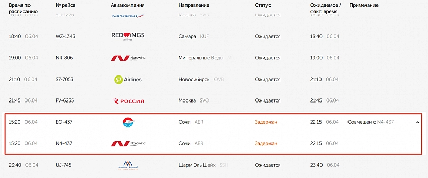 Утром 6 апреля аэропорт Сочи работает по фактическому расписанию: открыта регистрация, самолеты обслуживаются на перроне. Пассажирам, летящим через южные аэропорты, стоит следить за обновлениями на табло — часть задержанных рейсов все еще отправляется с опозданием.