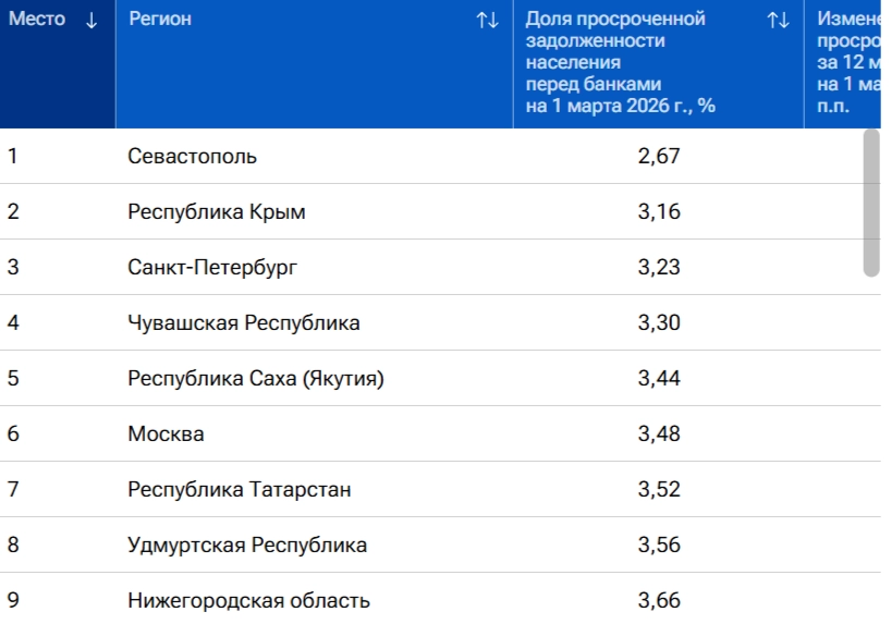 По данным на 1 марта 2026 года, Нижегородская область вошла в топ-10 регионов России с наименьшей долей просроченных долгов жителей перед банками. Доля составила всего 3,66 %, сообщает РИА Новости.