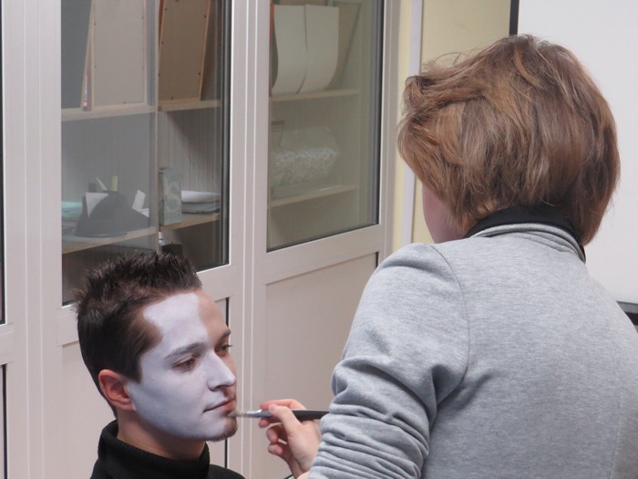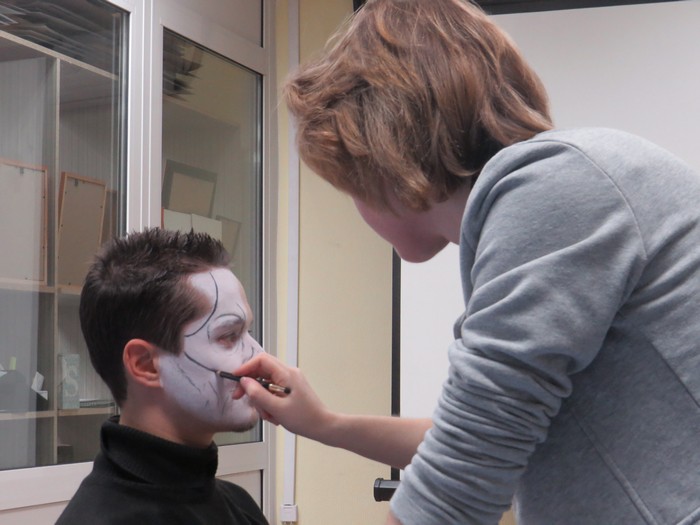 "Ну вот мы и подошли к главной фазе нашей гримировки. Наносить рисунок поверх основы можно подводкой, гримом другого цвета или акварелью. Здесь мы будем использовать самый простой черный грим и акварель"