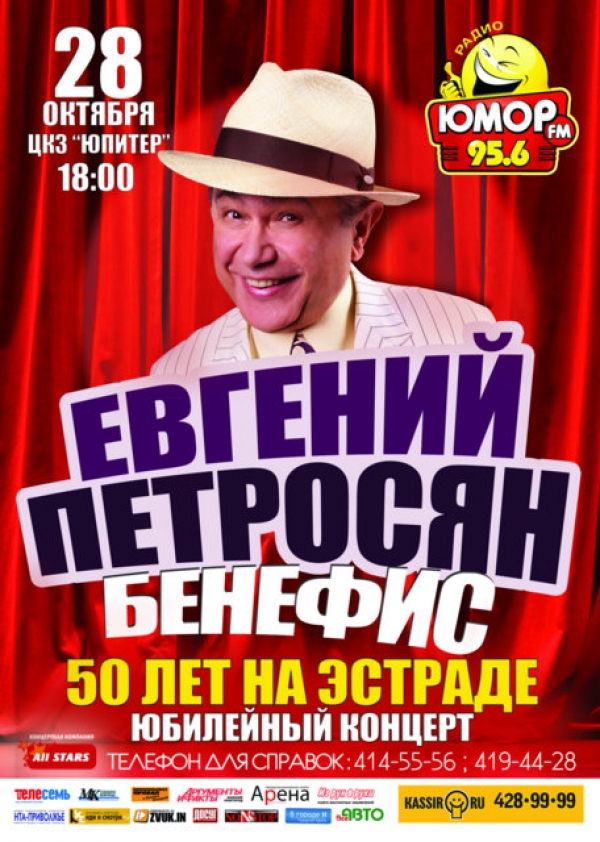 Октябрьский вечер будет приятно провести в дружеской компании с юмористом Евгением Петросяном. В Нижнем Новгороде артист даст юбилейный концерт «Бенефис. 50 лет на эстраде». Смех Петросяна всегда добрый, простой и заразительный. Его шутки всегда остроумны и злободневны. Поднимите настроение себе и своим друзьям в компании Евгения Петросяна.