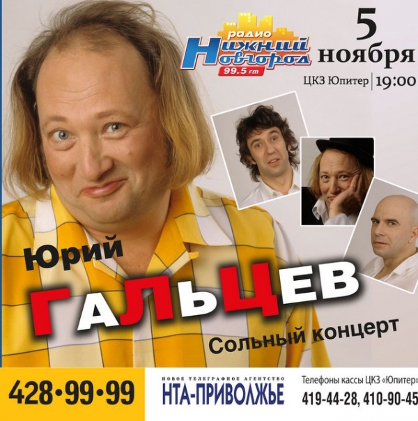 Блистательный комик, заслуженный артист российской эстрады и клоунады Юрий Гальцев приедет в наш город 5 ноября. Сейчас Гальцев считается одним из самых популярных комиков страны. Публика на его концертах всегда радостно реагирует на оригинальные номера и добрую энергетику, которую дарит артист.