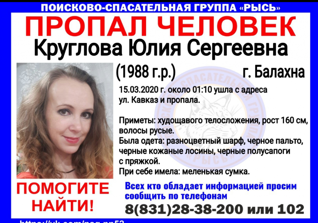 Ночью 15 марта 31-летняя женщина ушла из доа на улице Кавказ в Балахне и обратно до сих пор не вернулась. На связь с родными и близкими не выходит.