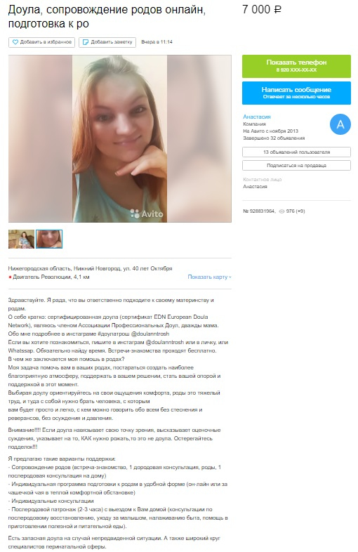Еще одна девушка из Нижнего Новгорода - Анастасия предлагает услуги доула. За подготовку к родам и их сопровождение она просит 7000 рублей. За эти деньги женщина предлагает следующие варианты поддержки: