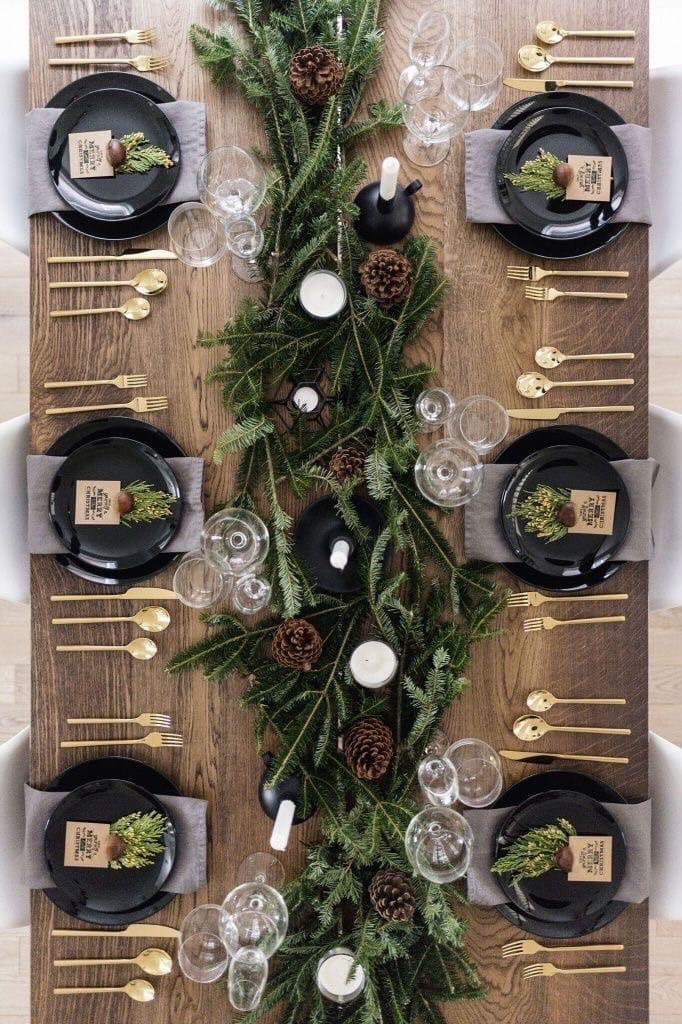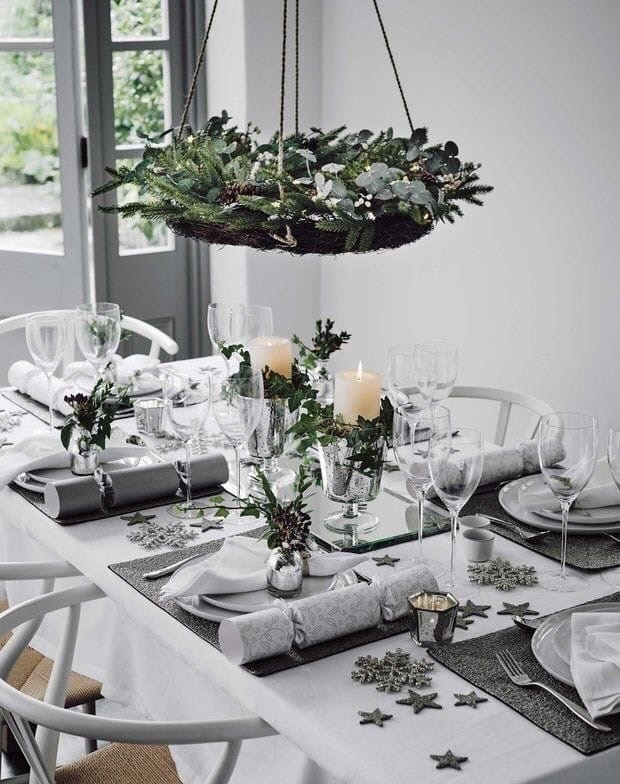 Сделайте текстильный раннер (столовая дорожка вдоль стола), или положите красивую скатерть, но сдержанных тонов. Добавьте множество различных по высоте подсвечников и свечей в общей цветовой гамме, они создают и уют, и праздничную атмосферу. Если вы боитесь открытого огня, приобретите светодиодные. Кроме этого можно приобрести небольшую композицию из датской ели и украсить стол ей.