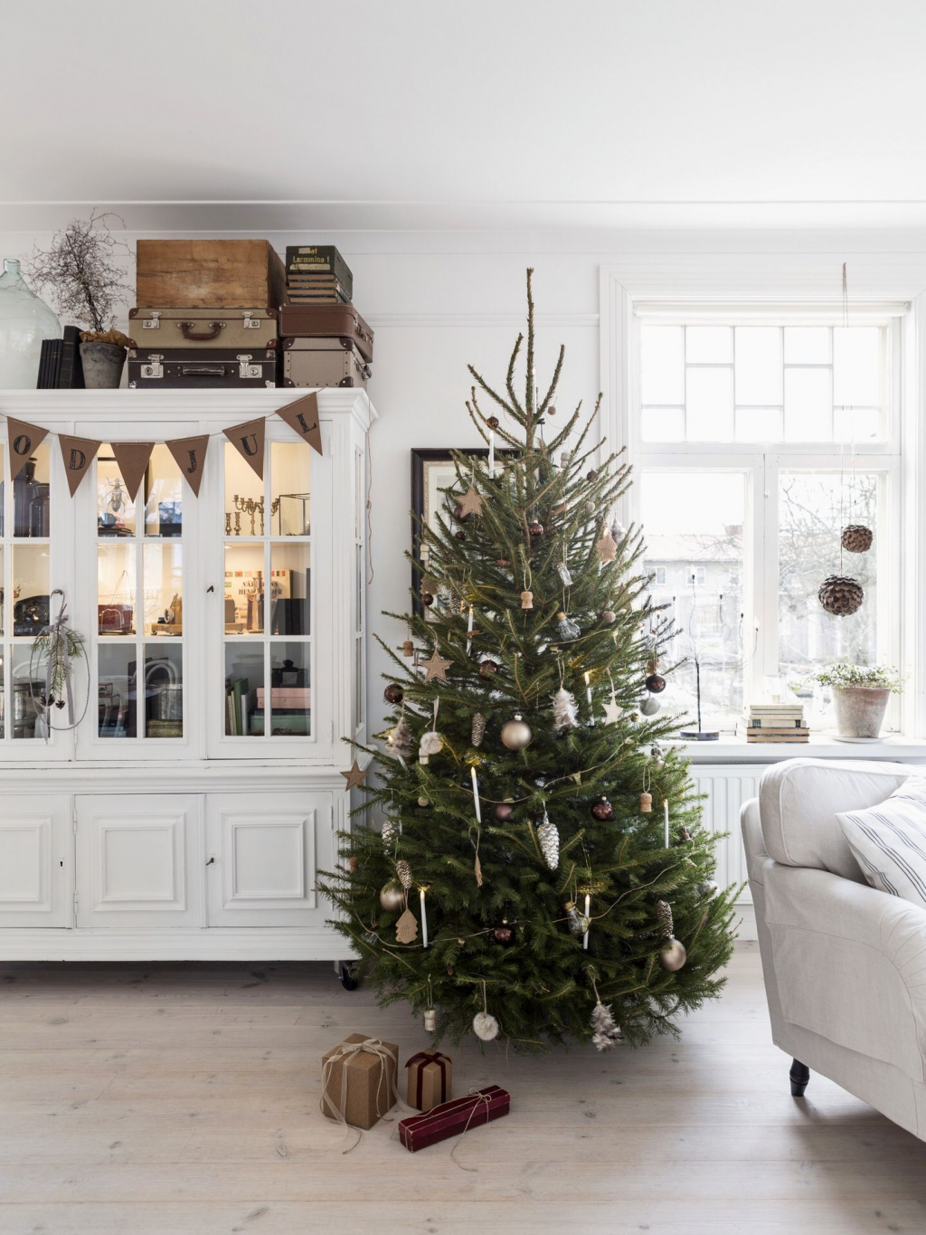 Я бы порекомендовала обратиться к хюгге — это датская концепция, особого состояния счастья и уюта, становится все более популярной. Тепло, светло и ароматно — вот необходимые условия для хюгге. А вот главный враг этого метода — беспорядок, поэтому не переусертствуйте с обилием декора. А елку расположите так, что бы было всем удобно и приносило счастье.
