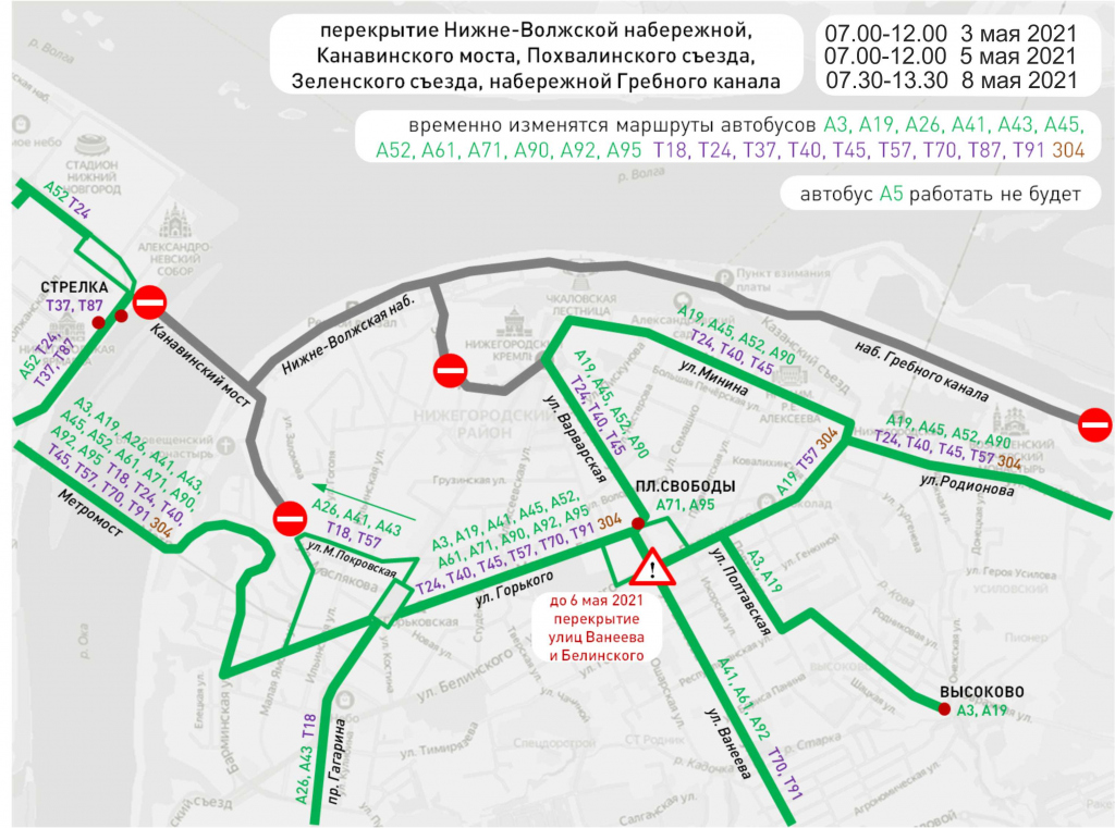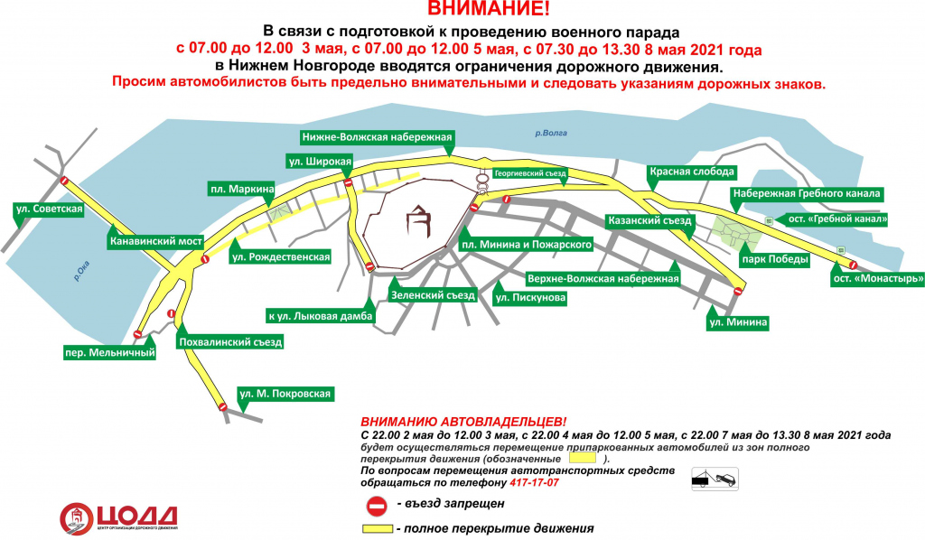 Так 3 мая (с 07.00 утра до 12.00), 5 мая (с 07.00 утра до 12.00) и 8 мая (с 07.30 утра до 13.30) движение перекроют на Нижневолжской набережной, улице Рождественской, Зеленскому съезду, в районе участка от улицы Широкой до Коромысловой башни Нижегородского кремля, на улице Широкой, Георгиевскому, Казанскому съездам, Похвалинскому съезду в районе участка от Благовещенской площади до пересечения с улицей Ярославской, по Канавинскому мосту, набережной Гребного канала в районе участка от Казанского съезда до дома № 110, А по улице Слобода Печеры.