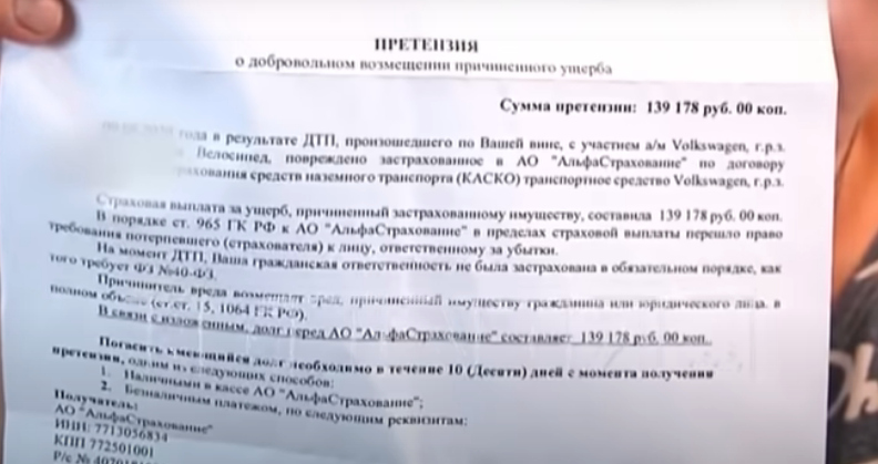 Представитель страховой компании рассказал, что после ДТП к ним обратилась девушка и за счет средств страховой компании отремонтировала автомобиль. А они в свою очередь после получения окончательной суммы ремонта выставили претензию о добровольном возмещении причиненного ущерба на 139 178 рублей. При этом ребенка и его законных представителей не вызывали в ГИБДД и не уведомляли в страховой компании о проведении экспертизы.